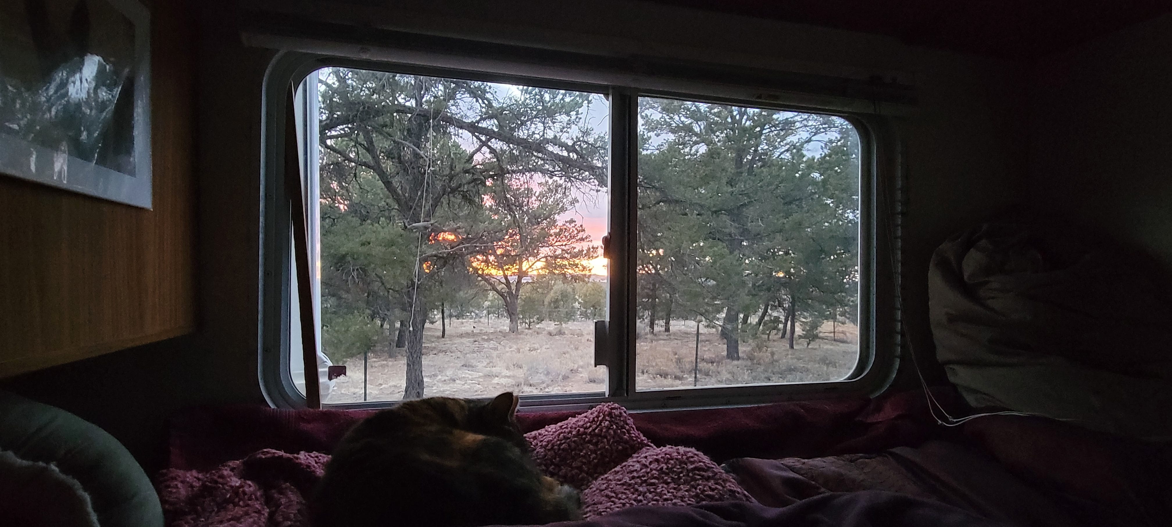 Actually, I have moved—about three-and-a-half miles away—to a peaceful spot in a stand of pinon trees on land that belongs to some friends. And I have succeeded in bringing Lyra, myself, and my little indoor garden through one of the coldest Januarys on record in NM, in a trailer with 2” walls. So there’s that.