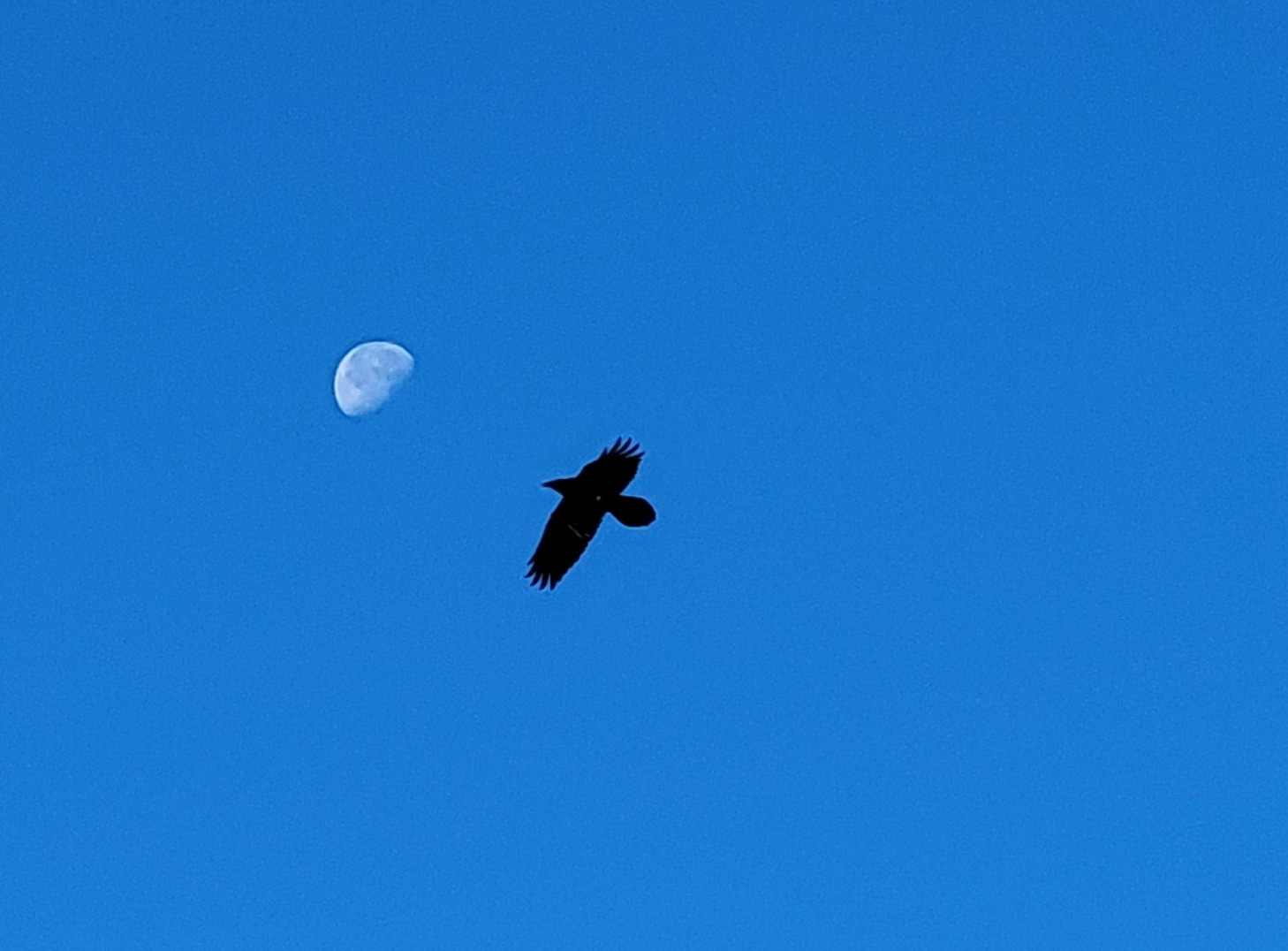 I hiked up there the other day to scout out a good spot to park Serenity. I was looking at my compass and thinking about cell-reception and afternoon shade when I heard the rush of wind through feathers. Before I could turn, a raven flew right over my head, looking down with a bright, gleeful eye, then arcing back up into the sky. Before I had recovered, a second raven buzzed me, then flew up to join its mate, quorking, a noise that sounds an awful lot like laughter. I watched them rise on the wind, feeling blessed.