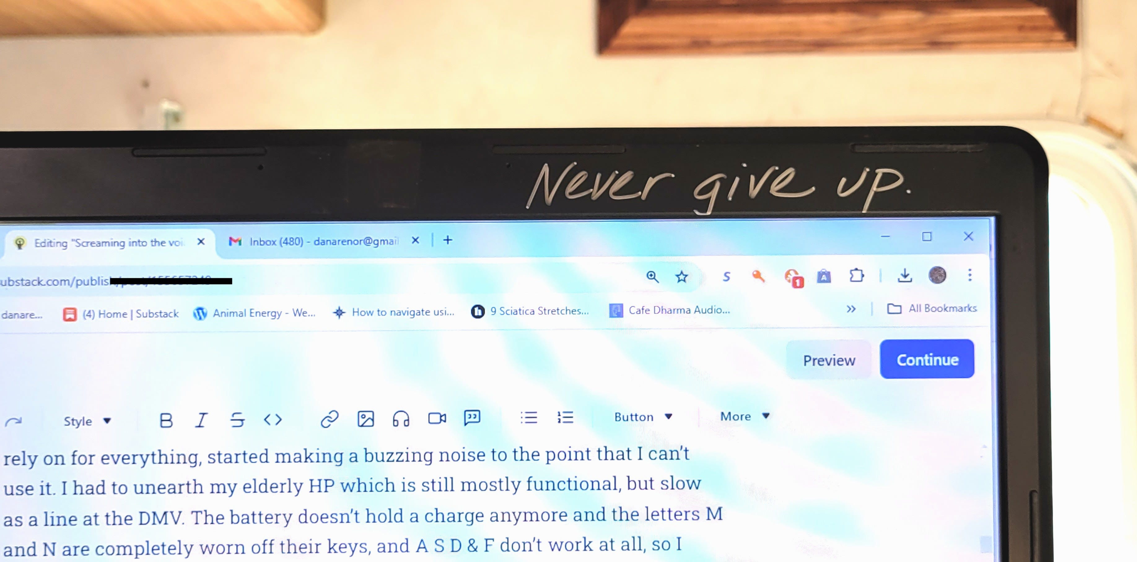 As if things weren’t difficult enough, my little Lenovo laptop, which I rely on for everything, started making a buzzing noise to the point that I can’t use it. I had to unearth my elderly HP Probook, which is still mostly functional, but slow as a line at the DMV. The battery doesn’t hold a charge anymore, and the letters M and N are completely worn off their keys, and A S D & F don’t work at all, so I have to use an external keyboard.